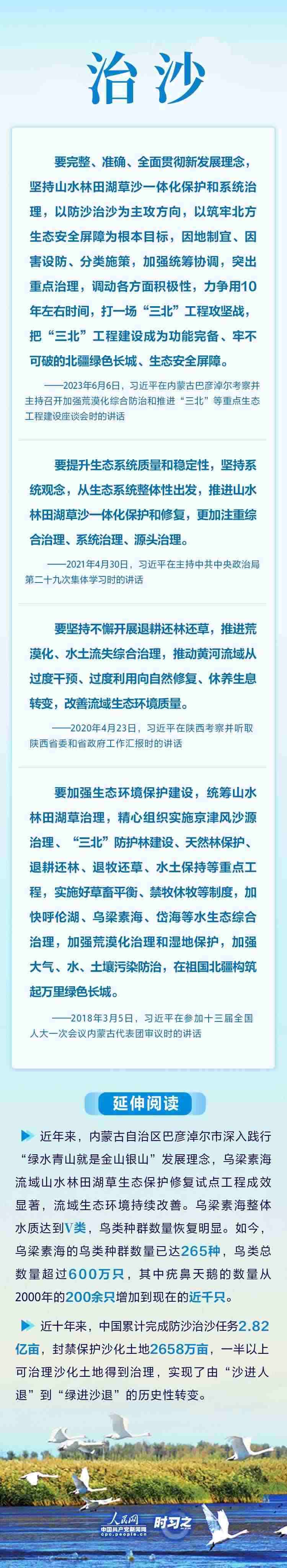 2023年6月5日至6日,中共中央總書(shū)記、國(guó)家主席、中央軍委主席習(xí)近平在內(nèi)蒙古自治區(qū)巴彥淖爾市考察,主持召開(kāi)加強(qiáng)荒漠化綜合防治和推進(jìn)“三北”等重點(diǎn)生態(tài)工程建設(shè)座談會(huì)并發(fā)表重要講話。