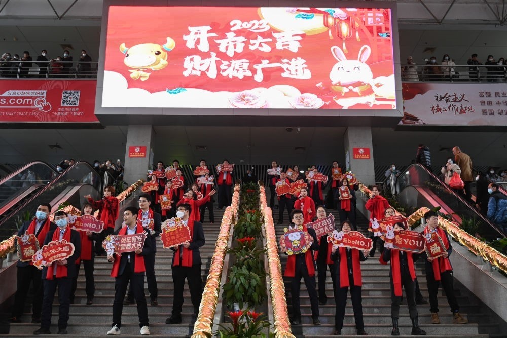 商戶代表在義烏國際商貿(mào)城的大廳進行文藝表演(2023年2月2日攝)。新華社記者 黃宗治 攝