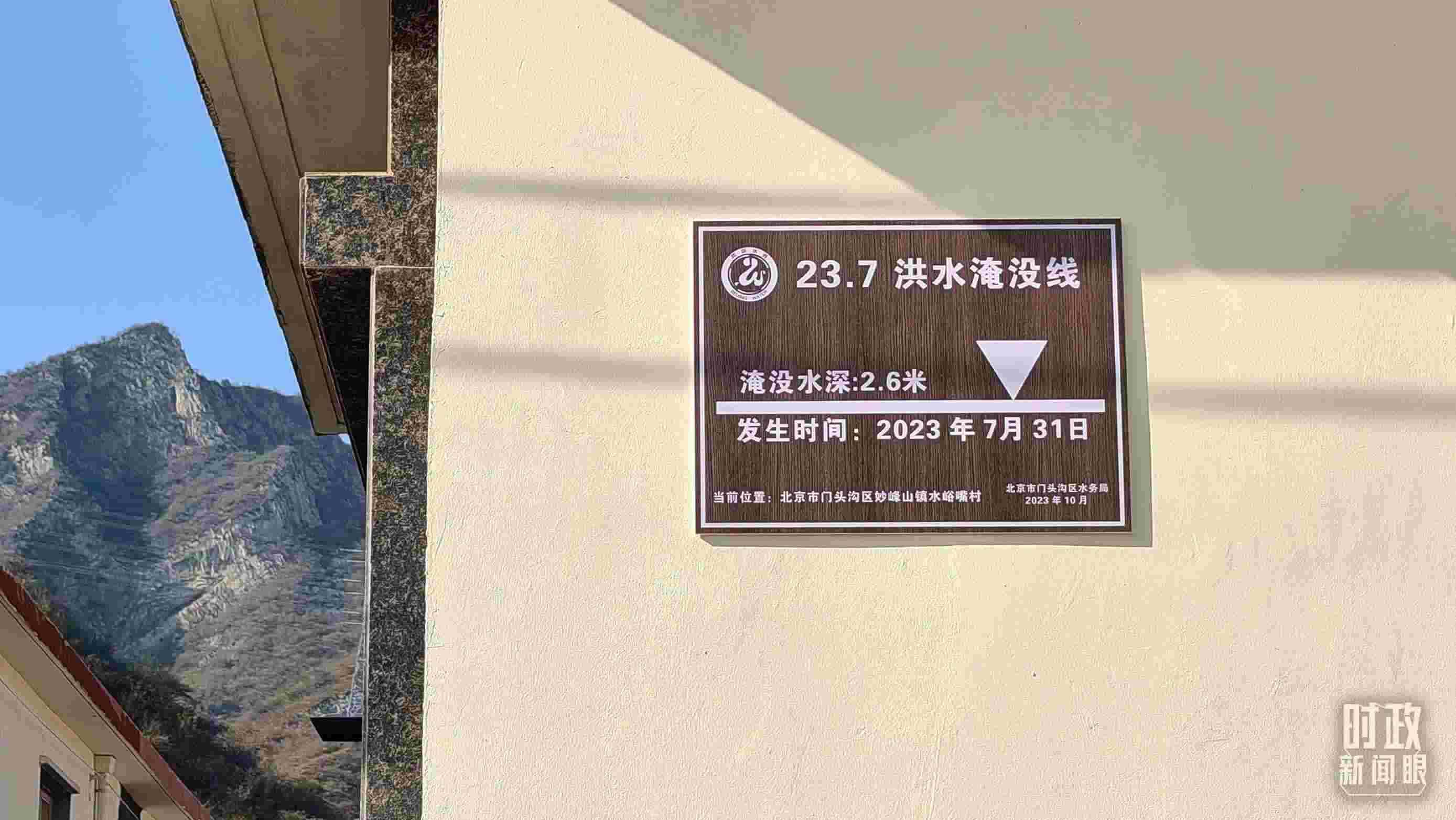 △ 村民房屋外設(shè)立了洪水淹沒線的標(biāo)牌。(總臺央視記者賈林拍攝)