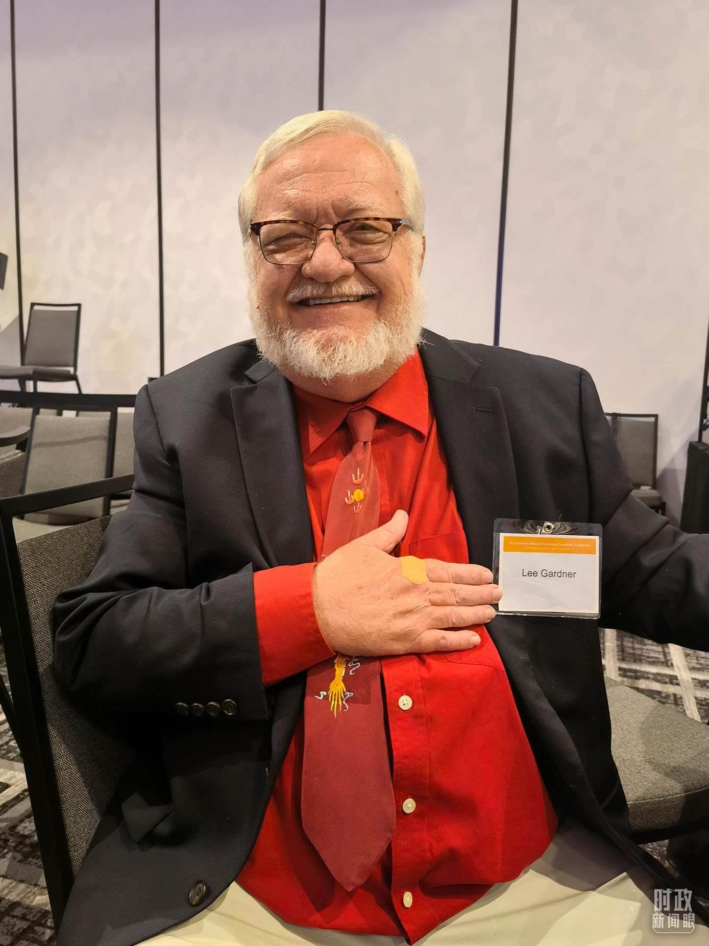 年逾70歲的李·加德納,是“鼓嶺故事”主人公密爾頓·加德納的侄孫。當(dāng)天他特意佩戴了一條繡有“中國龍”的領(lǐng)帶。(總臺(tái)央視記者石丞、國廣記者李晉拍攝)
