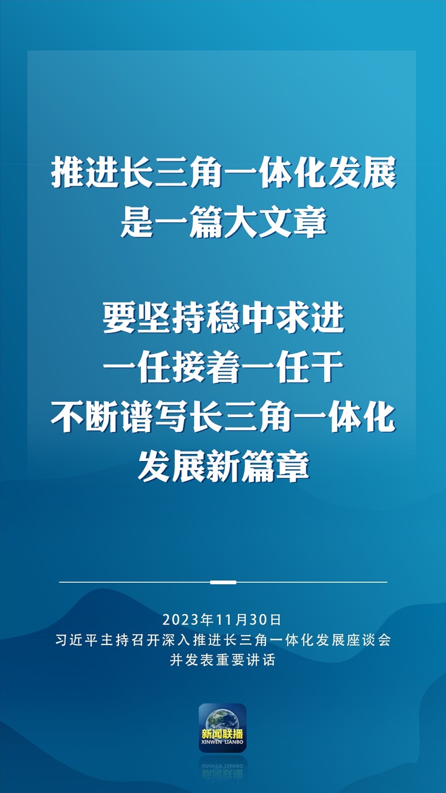 習(xí)近平強(qiáng)調(diào),要完整、準(zhǔn)確、全面貫徹新發(fā)展理念,緊扣一體化和高質(zhì)量這兩個(gè)關(guān)鍵詞,樹立全球視野和戰(zhàn)略思維,堅(jiān)定不移深化改革、擴(kuò)大高水平開放,統(tǒng)籌科技創(chuàng)新和產(chǎn)業(yè)創(chuàng)新,統(tǒng)籌龍頭帶動(dòng)和各揚(yáng)所長(zhǎng),統(tǒng)籌硬件聯(lián)通和機(jī)制協(xié)同,統(tǒng)籌生態(tài)環(huán)保和經(jīng)濟(jì)發(fā)展,在推進(jìn)共同富裕上先行示范,在建設(shè)中華民族現(xiàn)代文明上積極探索,推動(dòng)長(zhǎng)三角一體化發(fā)展取得新的重大突破,在中國(guó)式現(xiàn)代化中走在前列,更好發(fā)揮先行探路、引領(lǐng)示范、輻射帶動(dòng)作用。