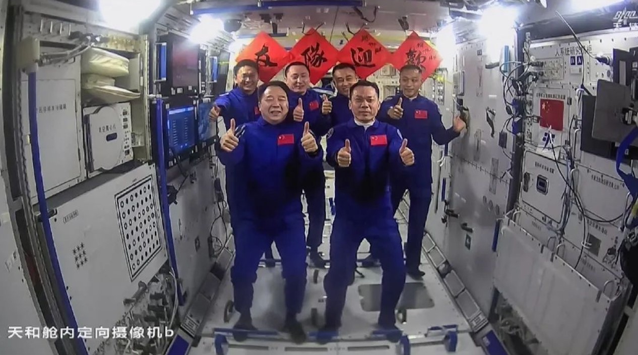 如今,中國(guó)空間站進(jìn)入應(yīng)用與發(fā)展階段。2023年12月31日晚,神舟十七號(hào)航天員湯洪波、唐勝杰、江新林在中國(guó)空間站收看習(xí)主席新年賀詞,三名航天員表示,要以自強(qiáng)不息的精神奮力攀登,把中國(guó)人的“太空家園”維護(hù)好、建設(shè)好。