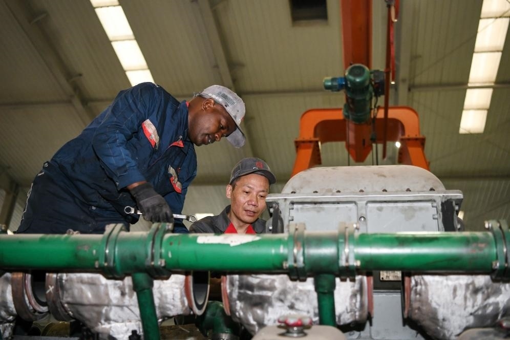 2023年7月4日,中國(guó)中車駐肯員工和肯方員工在肯尼亞內(nèi)羅畢的蒙內(nèi)鐵路機(jī)車維保車間工作。