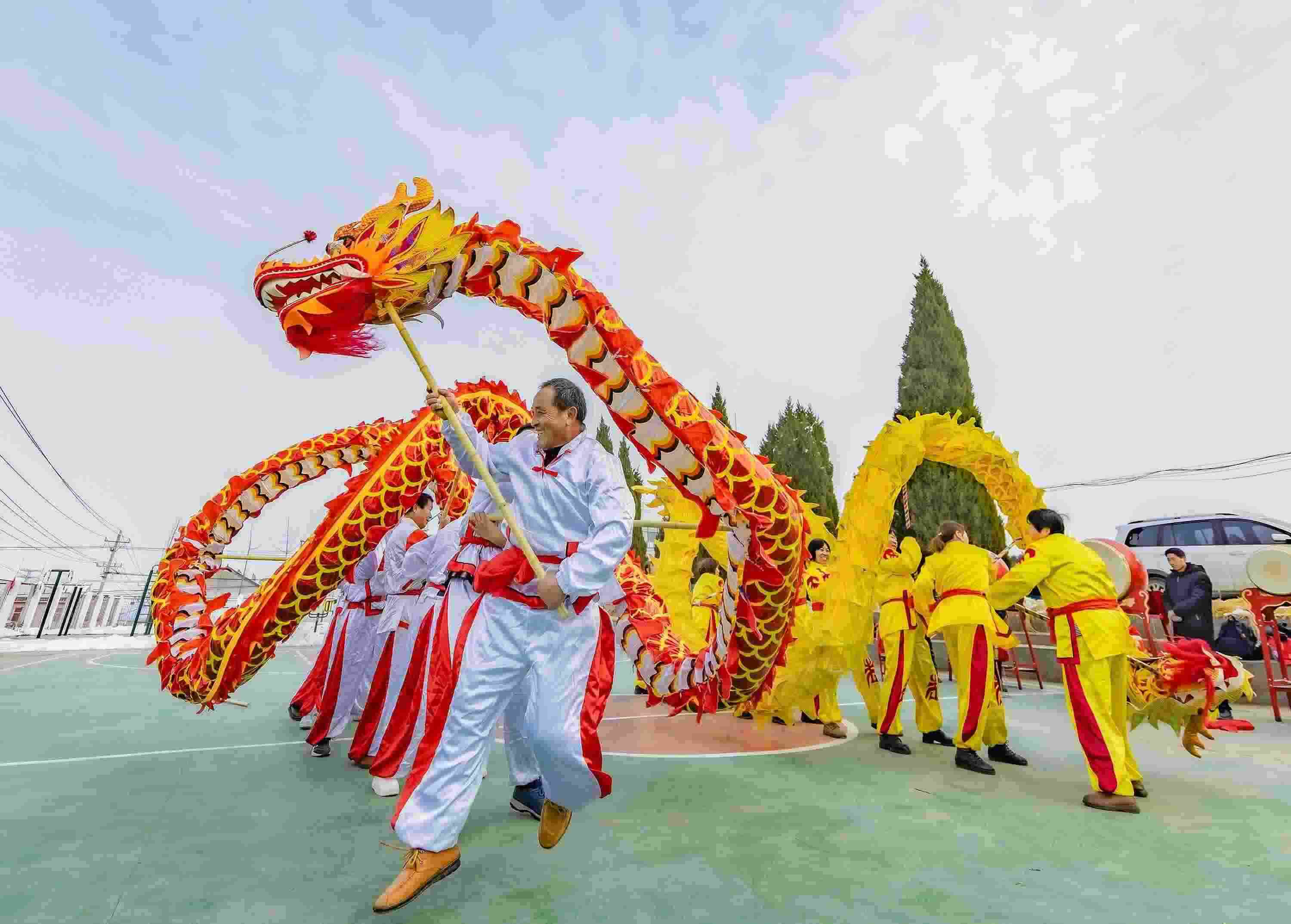 △ 江蘇宿遷兩支舞龍隊(duì)正在為村民表演雙龍狂舞鬧新春。