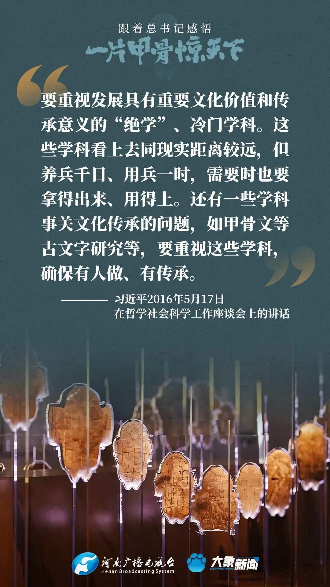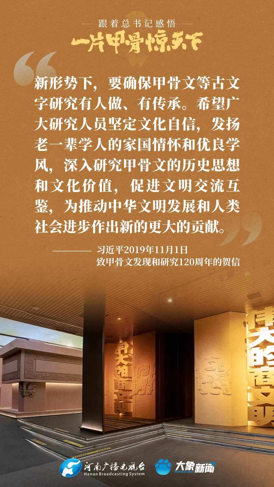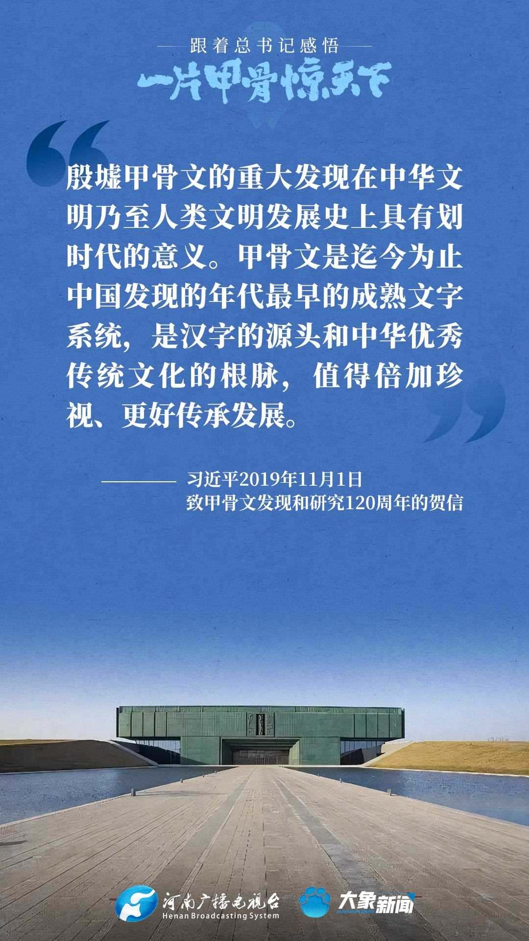 黨的十八大以來,習(xí)近平總書記多次就殷墟和甲骨文保護(hù)研究利用工作作出重要講話重要指示,為我們堅(jiān)定文化自信,傳承發(fā)展中華優(yōu)秀傳統(tǒng)文化提供了根本遵循。大象新聞邀您一起回顧、學(xué)習(xí)。