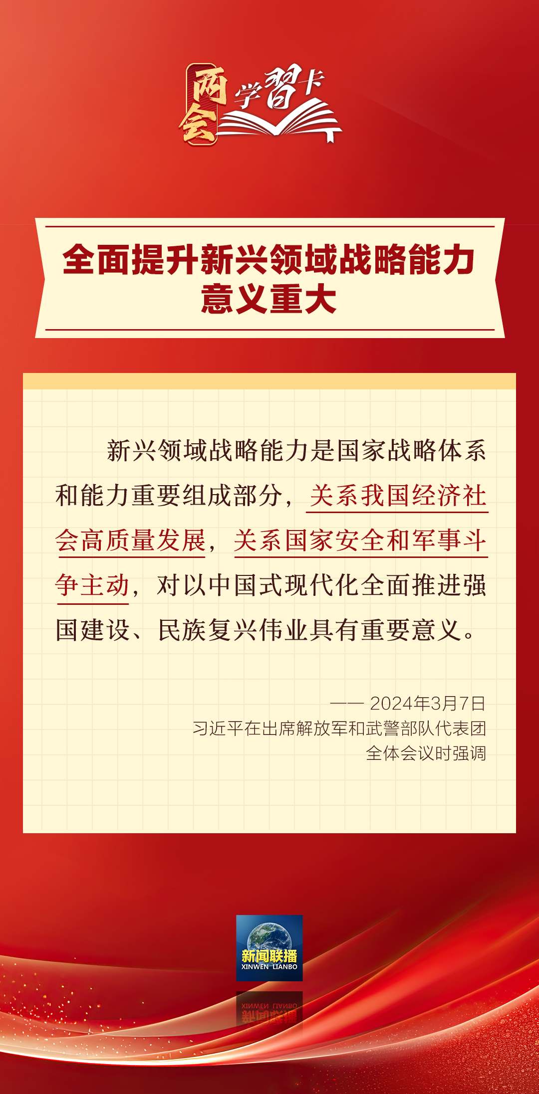 3月7日,習(xí)近平在出席解放軍和武警部隊代表團全體會議時強調(diào),強化使命擔(dān)當(dāng),深化改革創(chuàng)新,全面提升新興領(lǐng)域戰(zhàn)略能力。如何提升新興領(lǐng)域戰(zhàn)略能力?一起學(xué)習(xí)↓↓↓