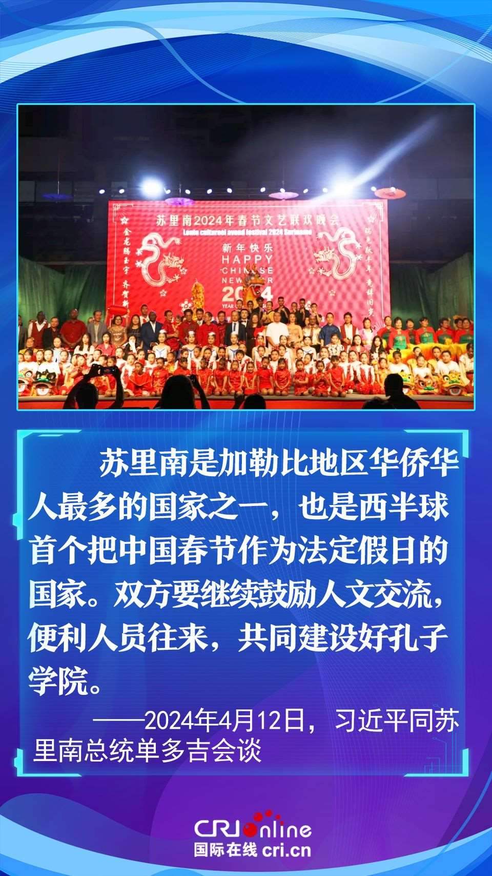 今年是中國(guó)和蘇里南建立戰(zhàn)略合作伙伴關(guān)系五周年。習(xí)近平主席在會(huì)談中以“源遠(yuǎn)流長(zhǎng)、歷久彌堅(jiān)”為中蘇友誼增添了新的注解,為推動(dòng)構(gòu)建更加緊密的中蘇戰(zhàn)略合作伙伴關(guān)系指明了方向。