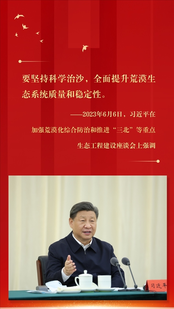 2023年6月5日至6日,習(xí)近平在內(nèi)蒙古巴彥淖爾考察,并主持召開加強(qiáng)荒漠化綜合防治和推進(jìn)“三北”等重點(diǎn)生態(tài)工程建設(shè)座談會。這是6日上午,習(xí)近平在臨河區(qū)國營新華林場考察。