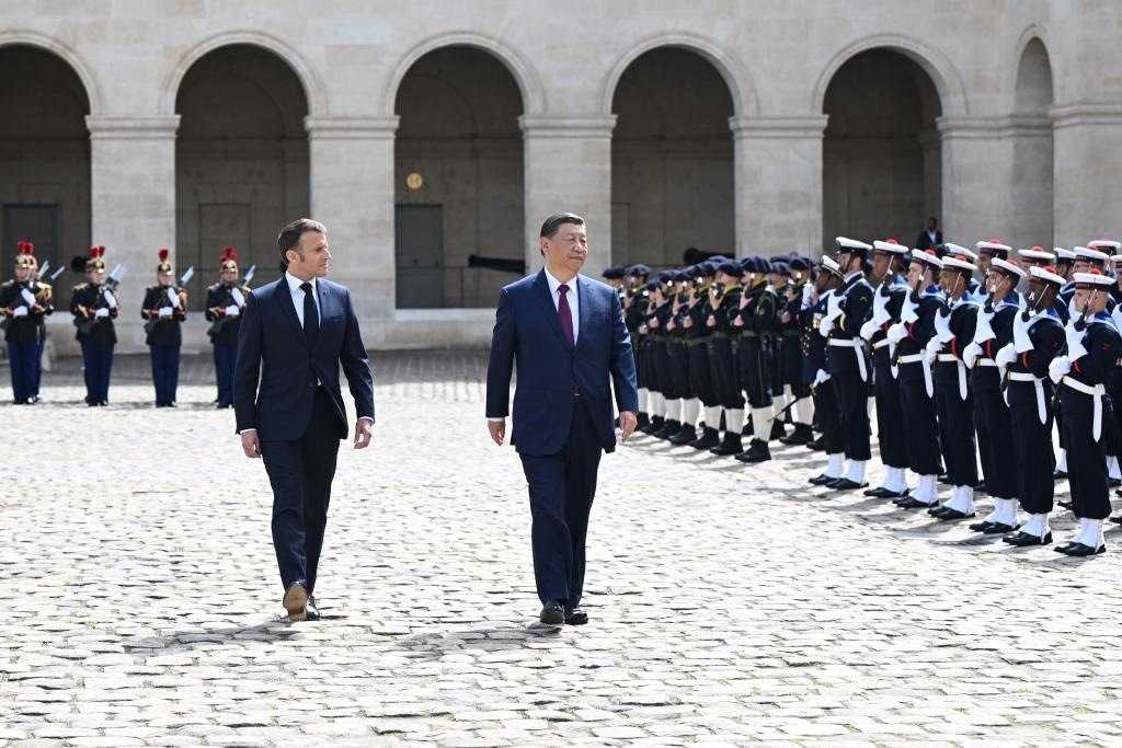 當(dāng)天下午,習(xí)近平在巴黎出席馬克龍舉行的隆重盛大歡迎儀式。兩國(guó)元首檢閱法蘭西共和國(guó)衛(wèi)隊(duì)和陸海空三軍儀仗隊(duì),并觀看分列式。