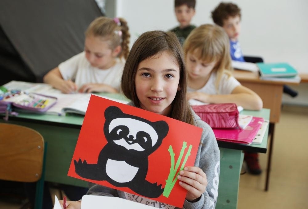△2024年5月3日,匈中雙語(yǔ)學(xué)校三年級(jí)學(xué)生寶怡展示自己的大熊貓形象美術(shù)作品。