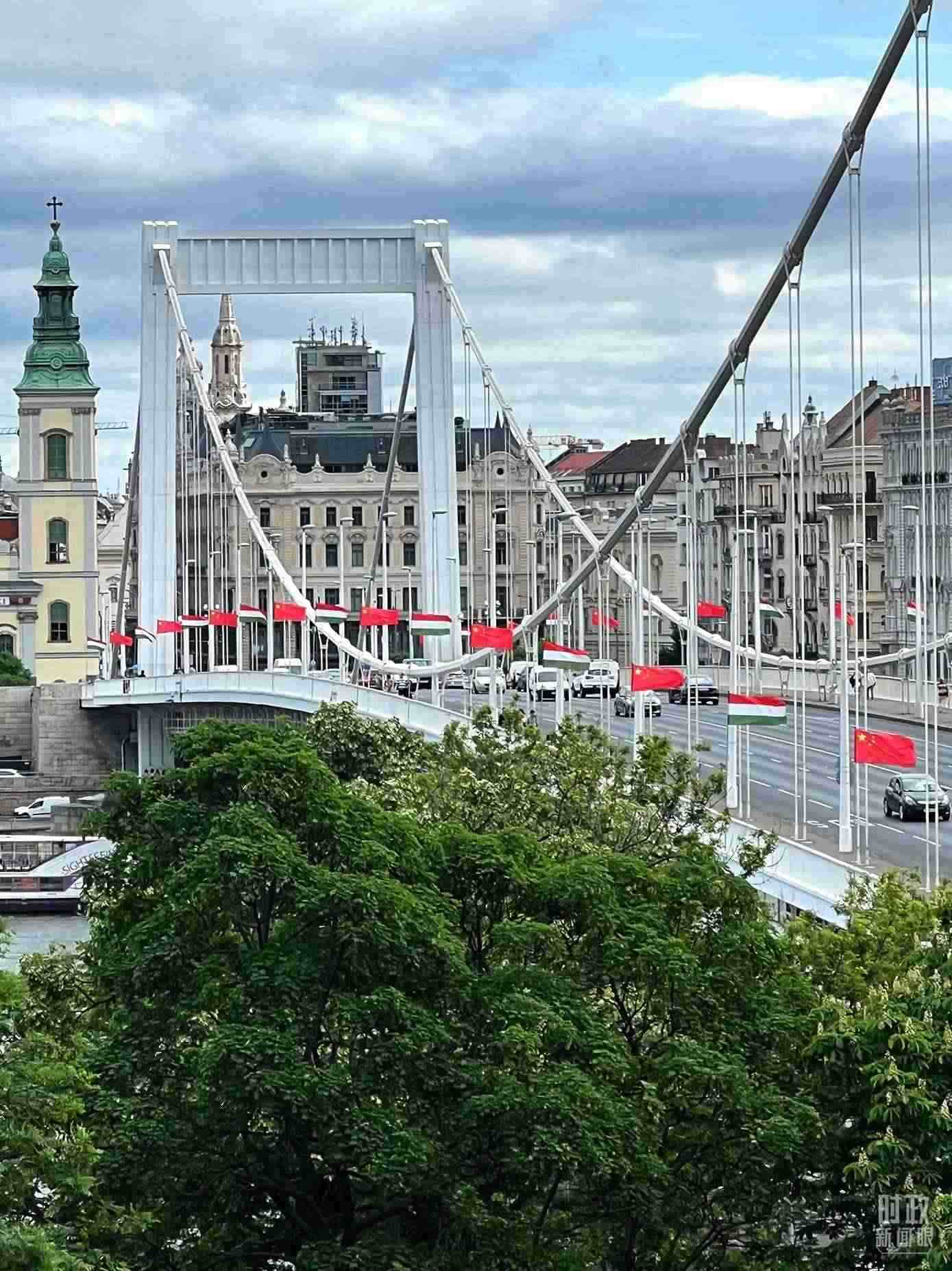 △懸掛中匈兩國(guó)國(guó)旗的布達(dá)佩斯伊麗莎白大橋。(總臺(tái)央視記者石偉明拍攝)