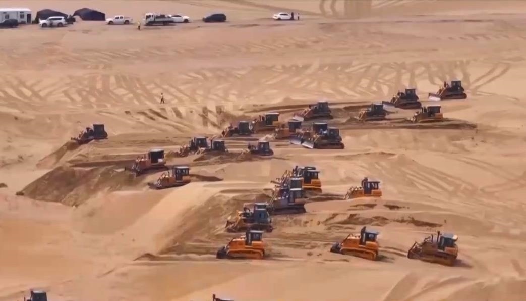 在內(nèi)蒙古鄂爾多斯的茫茫沙海中,近200臺(tái)推土機(jī)來(lái)回穿行,推平高低起伏、連綿不斷的沙丘,以便后續(xù)在此安裝光伏板。這正是當(dāng)下最新的光伏治沙模式中的一個(gè)環(huán)節(jié)。