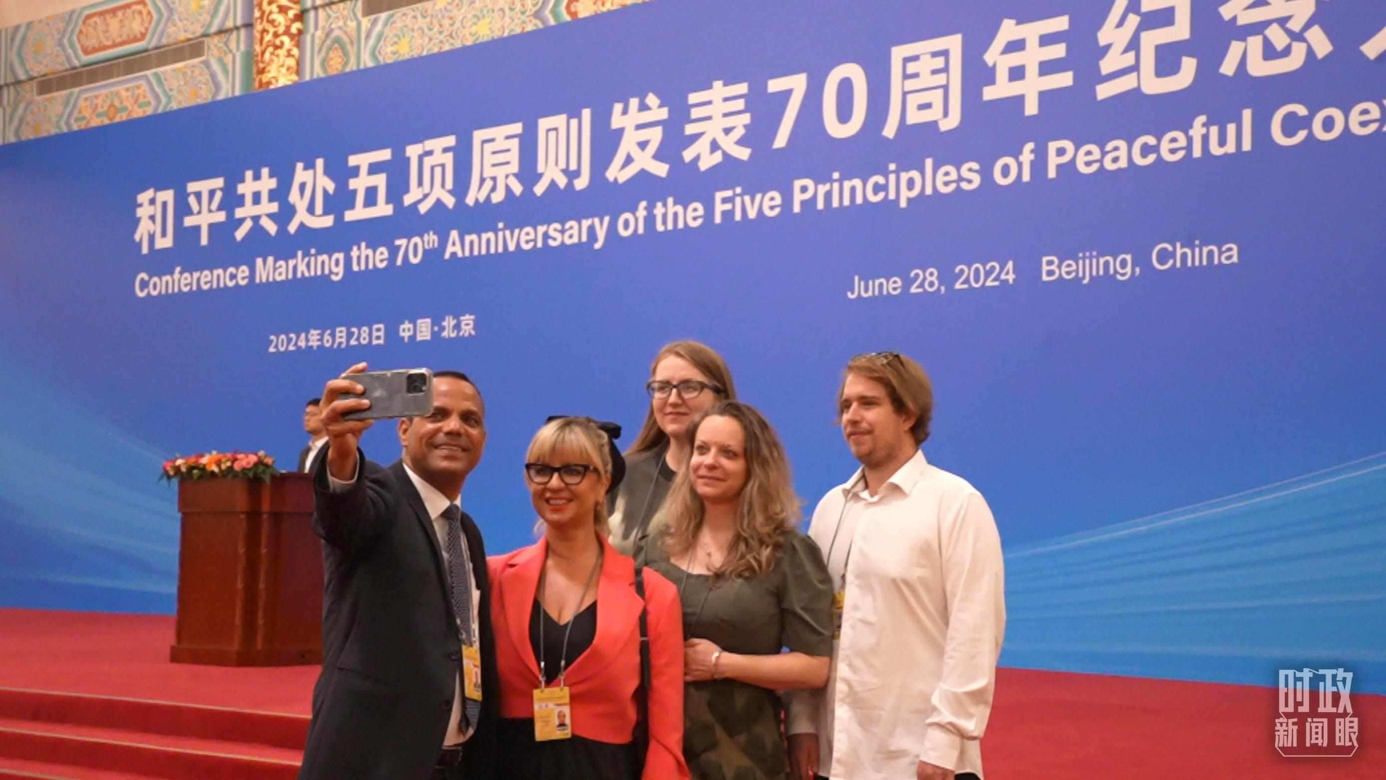 △出席紀(jì)念大會(huì)的外國嘉賓在現(xiàn)場合影留念。(總臺(tái)央視記者姚瑤拍攝)