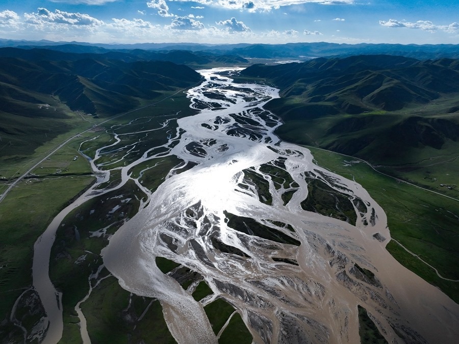 在青海省果洛藏族自治州達(dá)日縣境內(nèi)拍攝的黃河(2024年7月31日攝,無人機(jī)照片)。新華社記者 張龍 攝