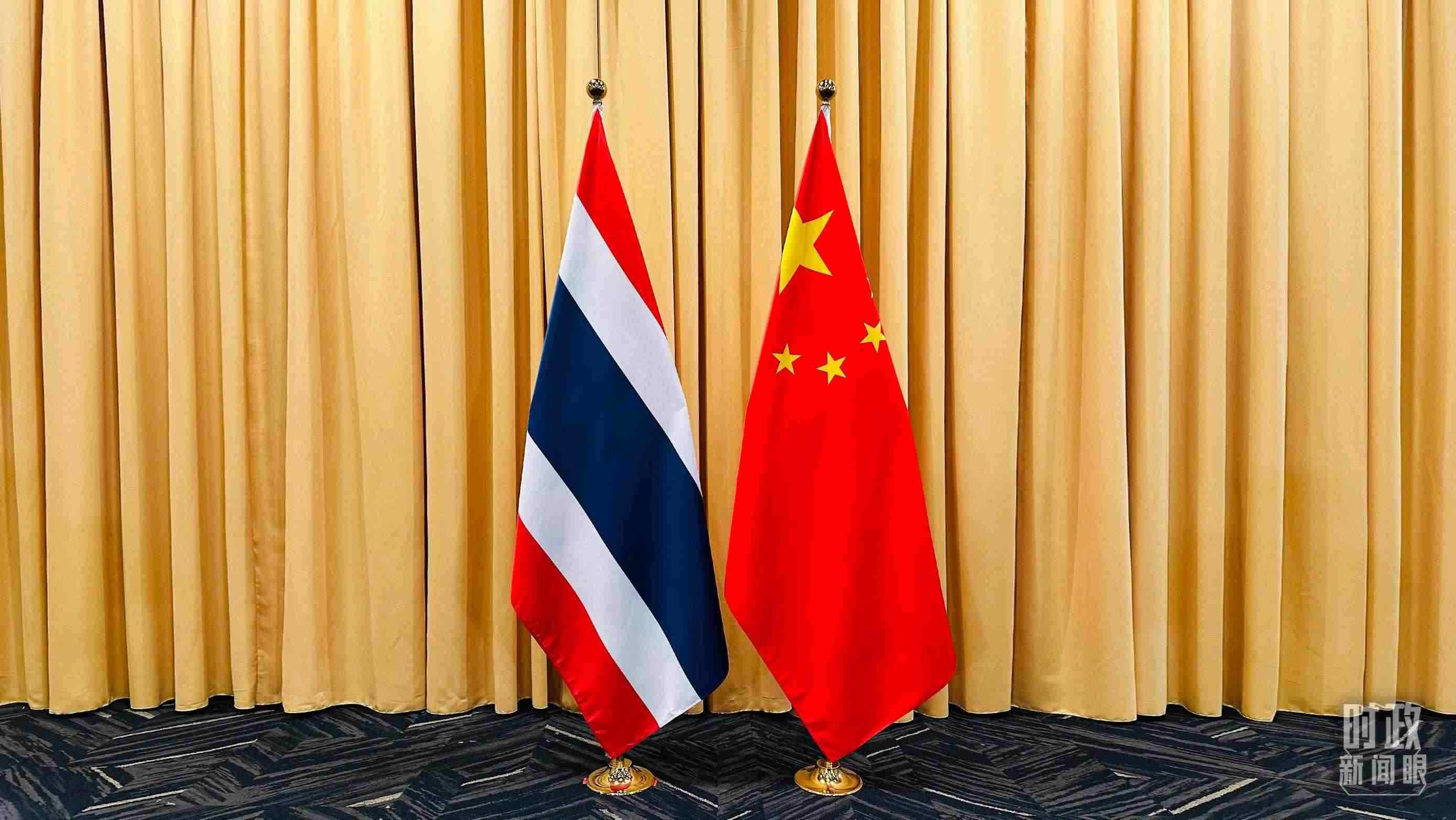 △會(huì)見(jiàn)現(xiàn)場(chǎng)的中泰兩國(guó)國(guó)旗。(總臺(tái)央視記者范一鳴拍攝)