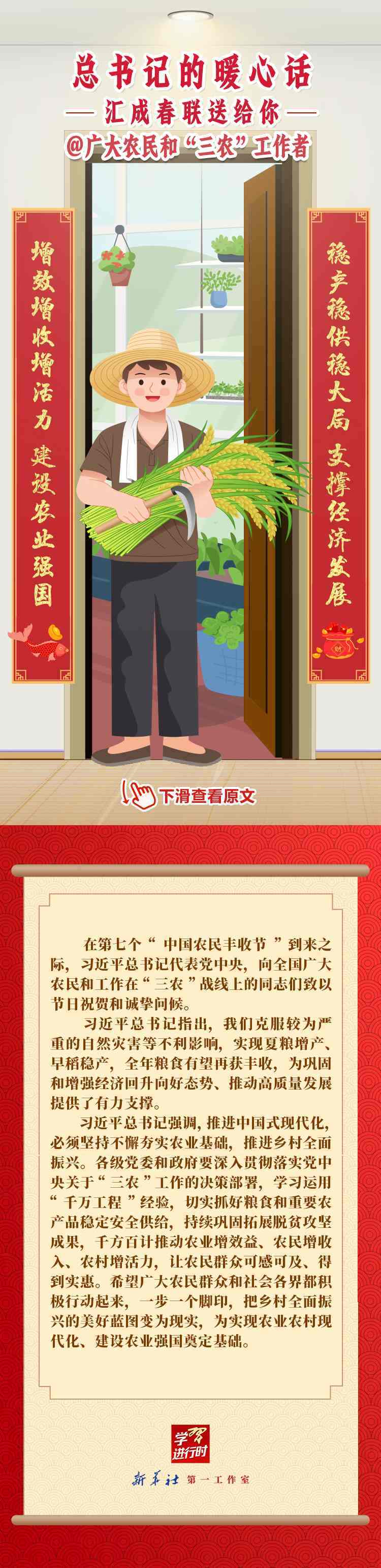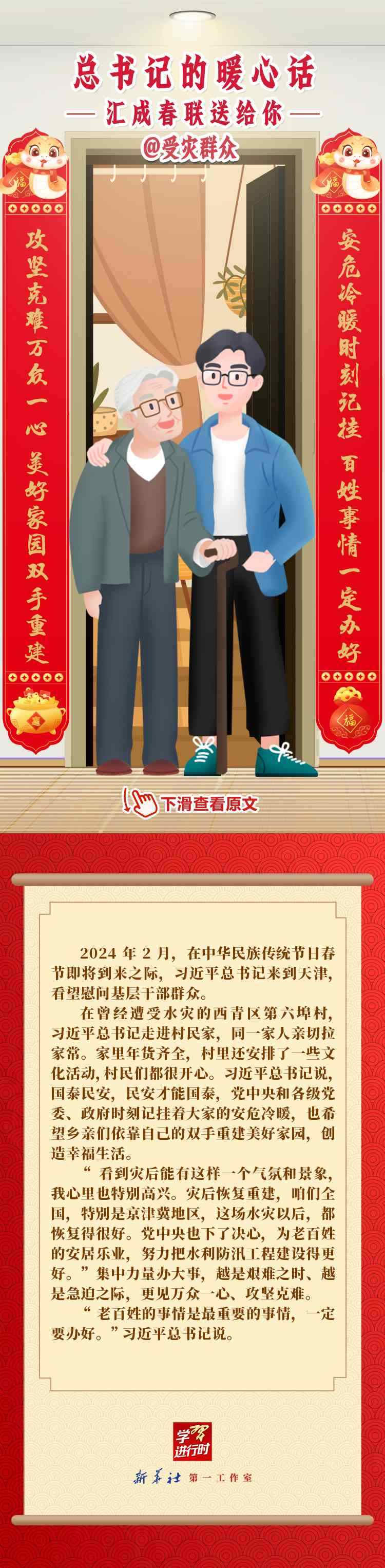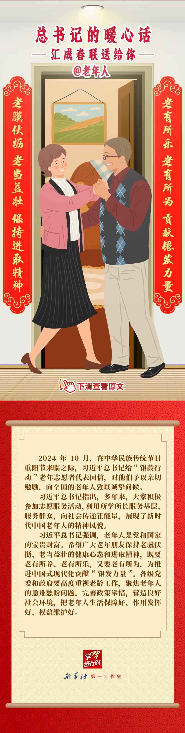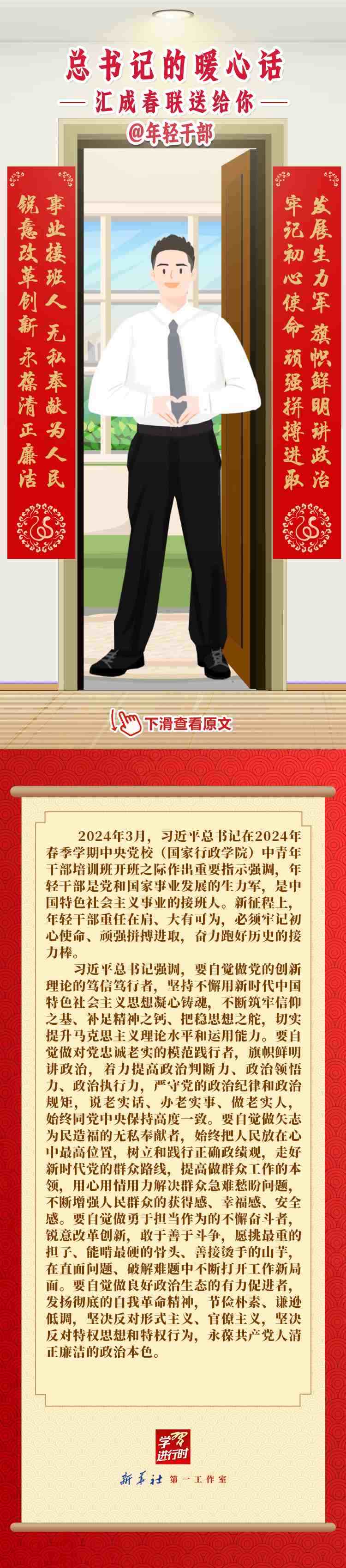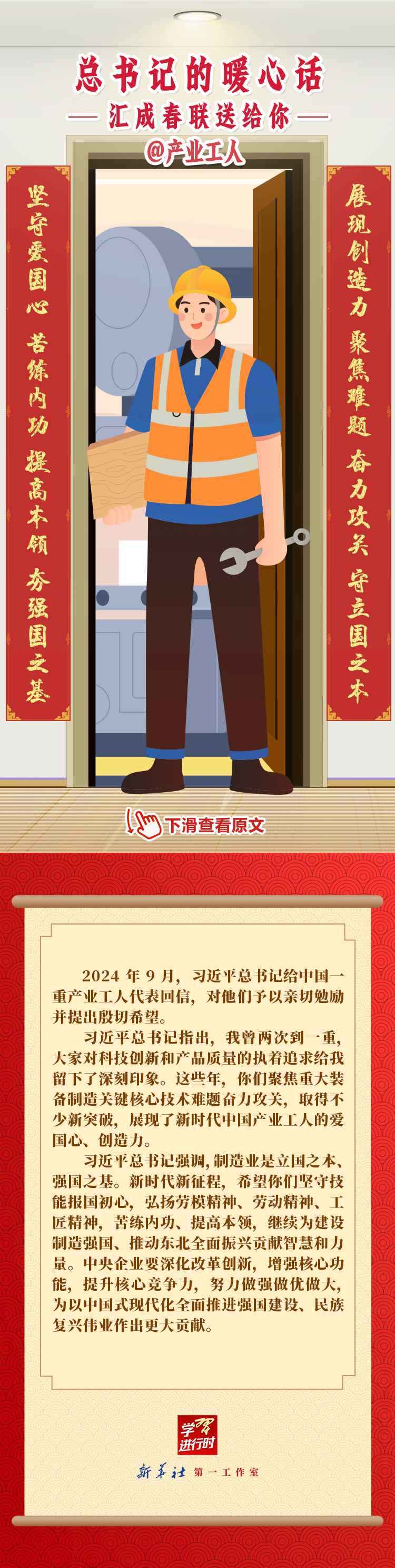 【學(xué)習(xí)進(jìn)行時】過春節(jié),貼春聯(lián),寄托人們對新年的美好愿望。過去一年,習(xí)近平總書記在不同場合點(diǎn)贊各行各業(yè)奮斗者,說了許多暖心話。新春之際,我們匯編成聯(lián),向新征程上的每一位“主角”致敬,送上新春的祝福。