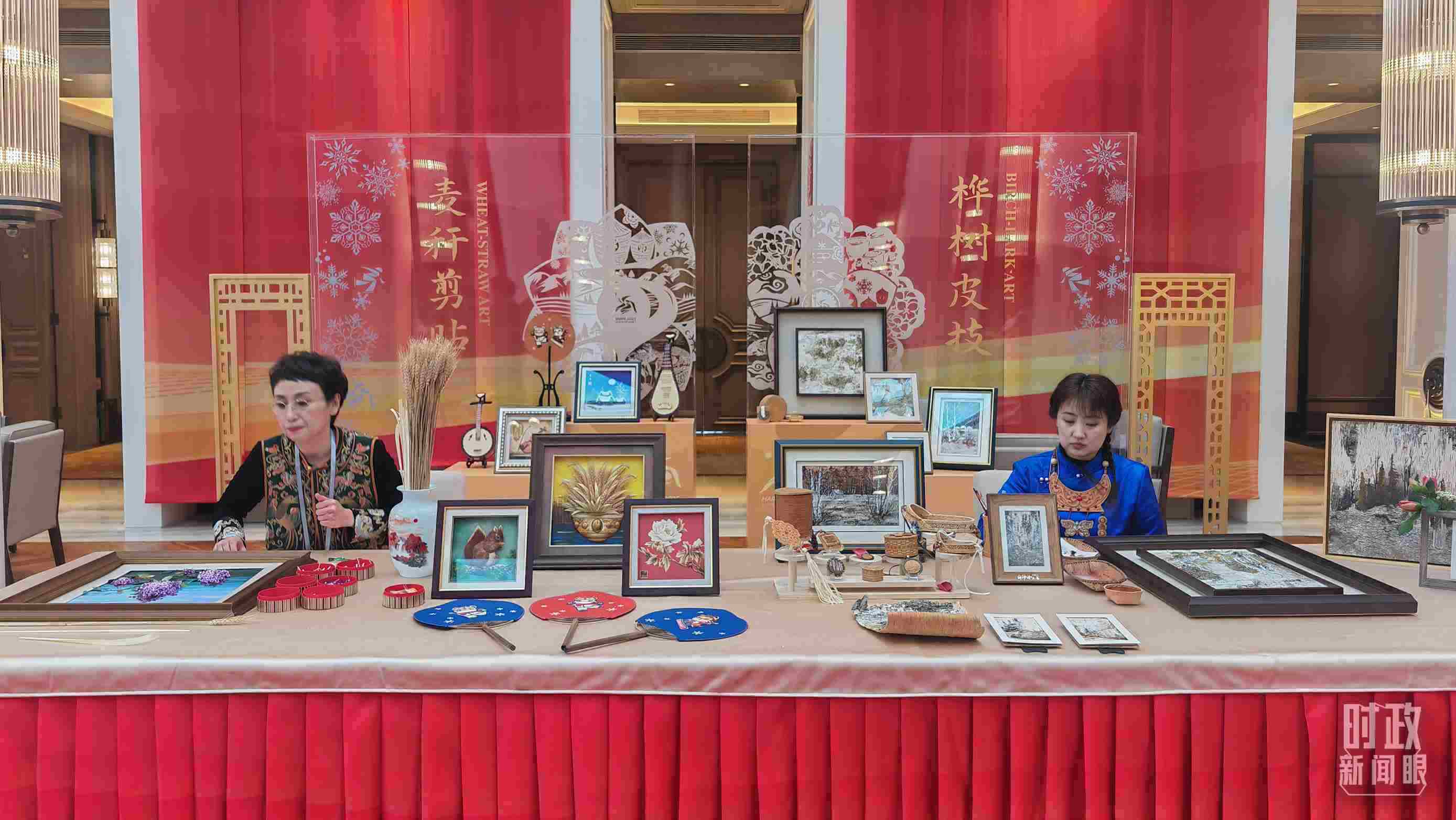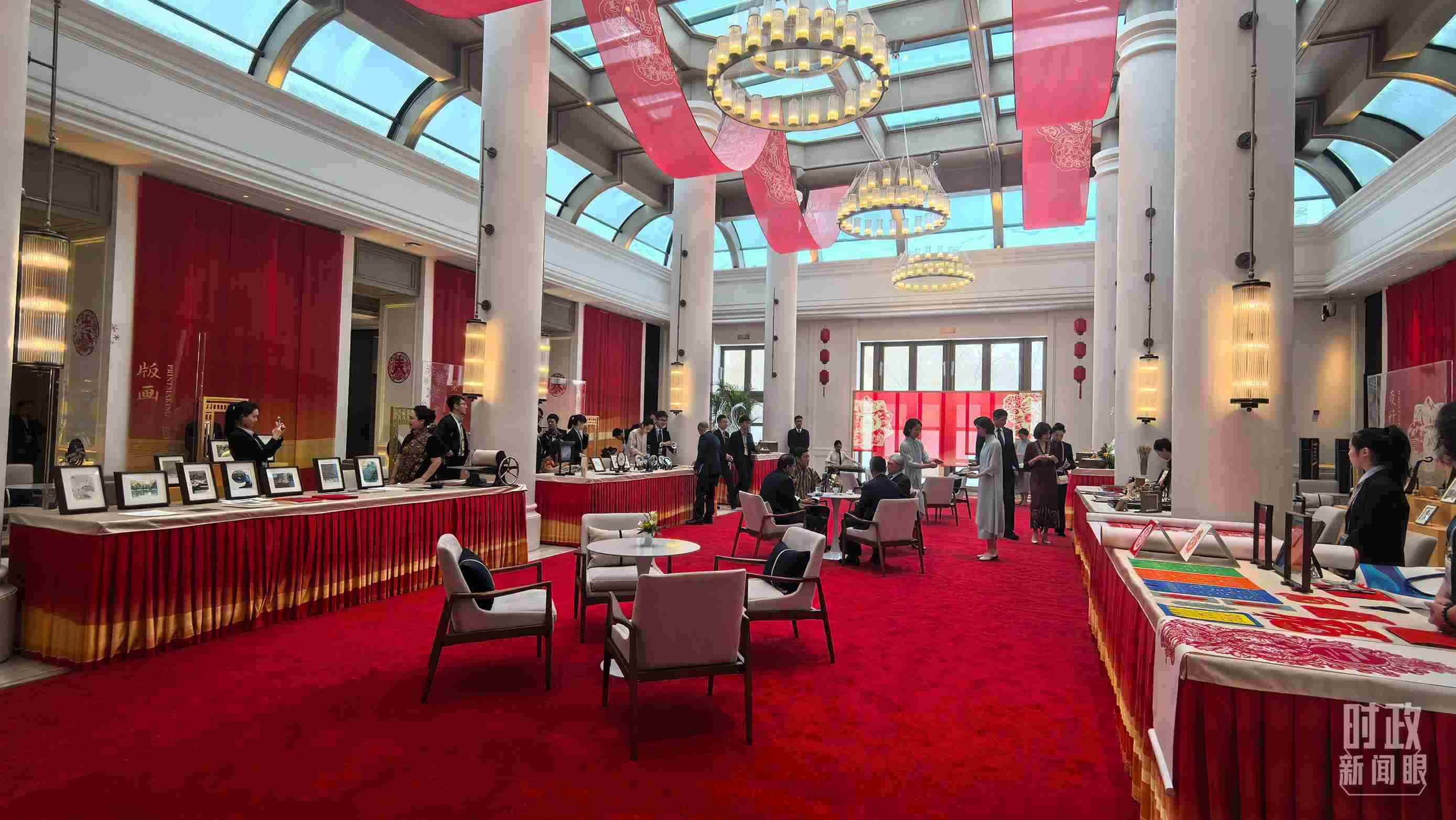 △歡迎宴會(huì)開(kāi)始前的黑龍江非物質(zhì)文化遺產(chǎn)展示。(總臺(tái)央視記者史偉、央廣記者馬喆拍攝)