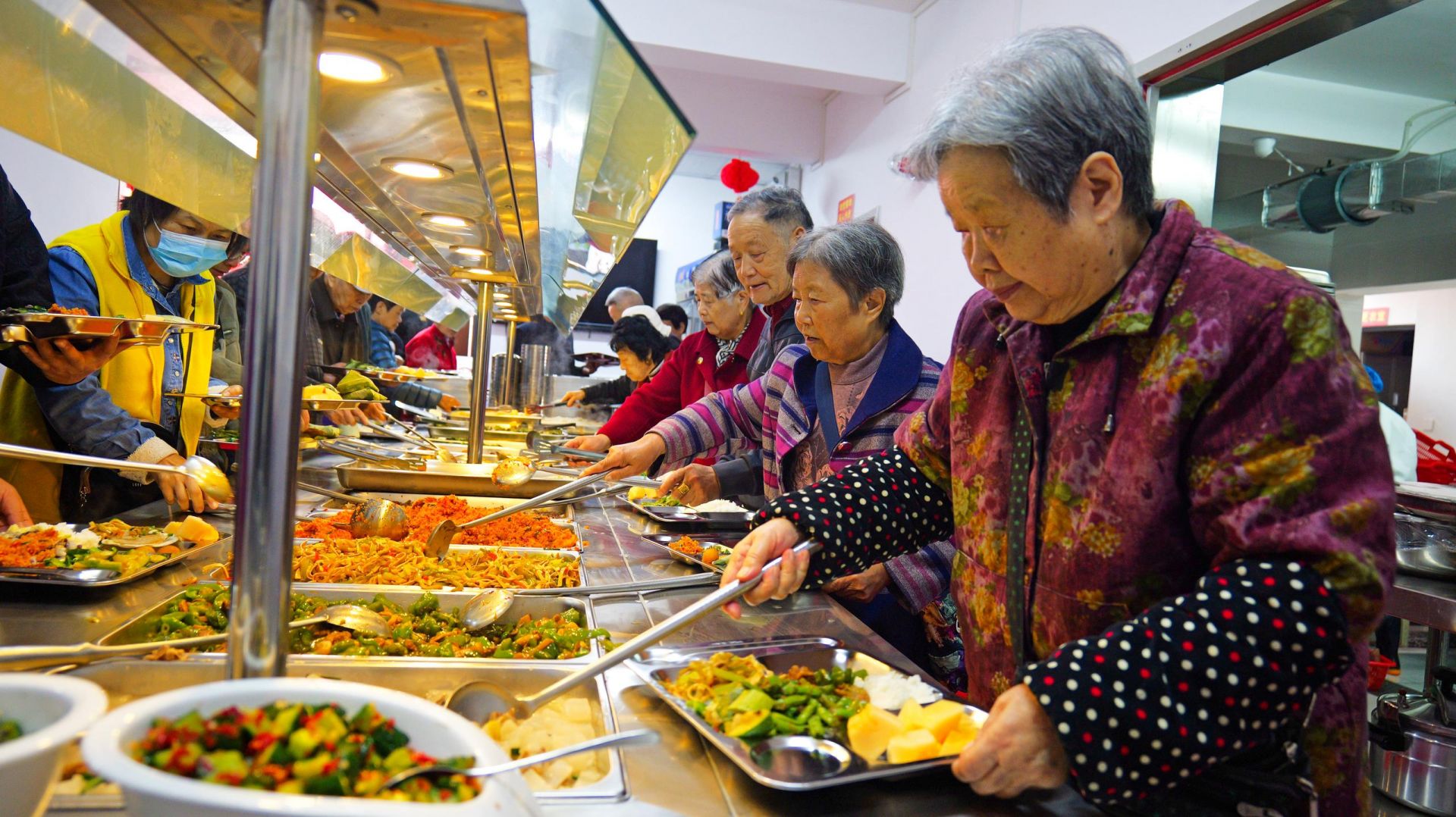 △湖北恩施一社區(qū)“幸福食堂”里,社區(qū)老人、退休職工在排隊取餐。