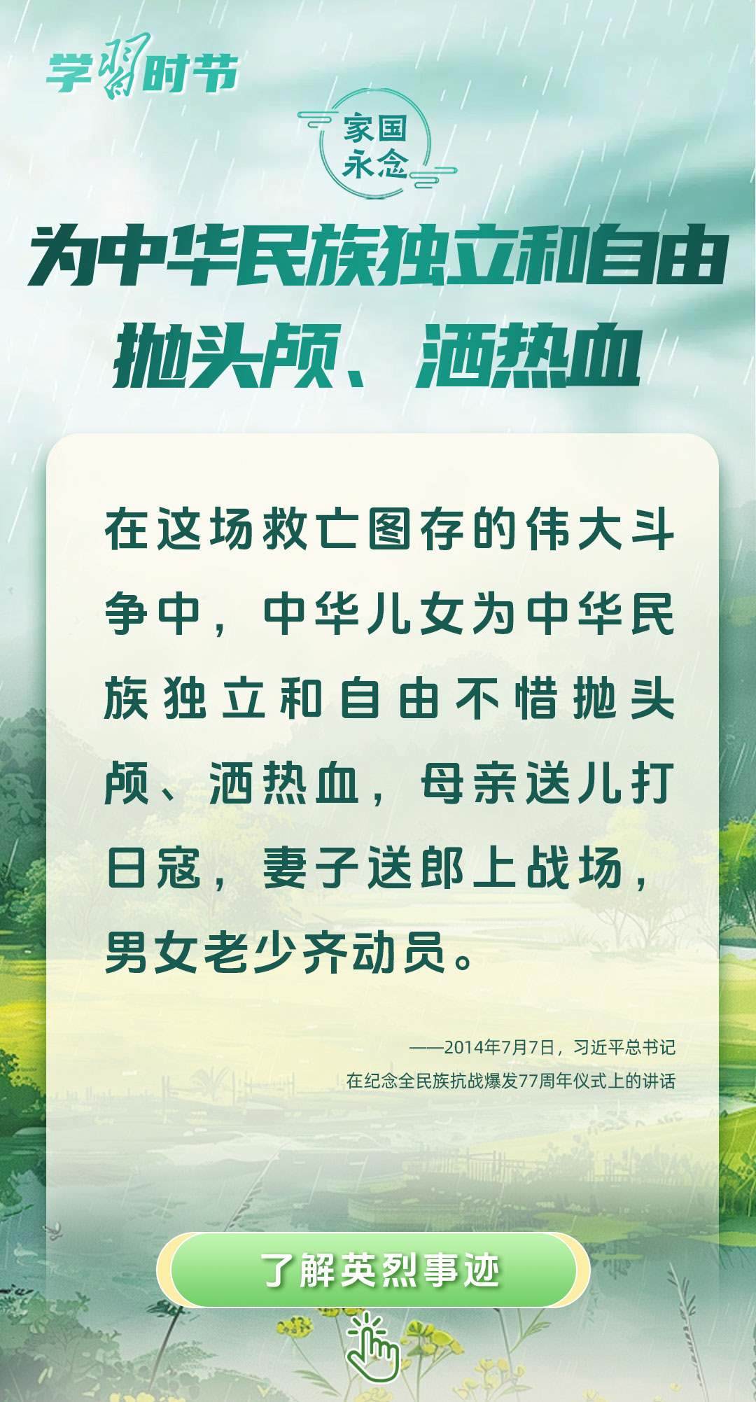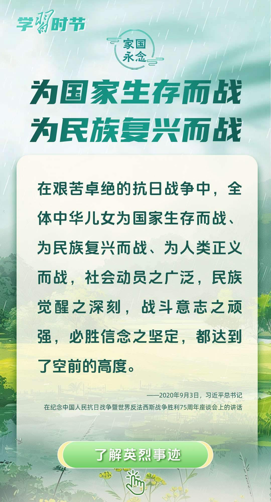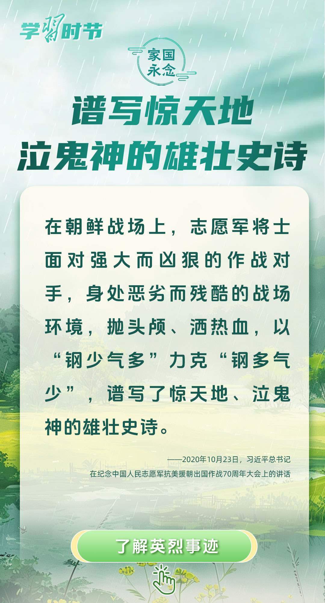 今年是中國人民抗日戰(zhàn)爭暨世界反法西斯戰(zhàn)爭勝利80周年、中國人民志愿軍抗美援朝出國作戰(zhàn)75周年。習(xí)近平總書記曾說:“對一切為國家、為民族、為和平付出寶貴生命的人們,不管時(shí)代怎樣變化,我們都要永遠(yuǎn)銘記他們的犧牲和奉獻(xiàn)。”今天我們所擁有的一切,無不凝結(jié)著英雄、英烈們的奉獻(xiàn)付出乃至巨大犧牲。