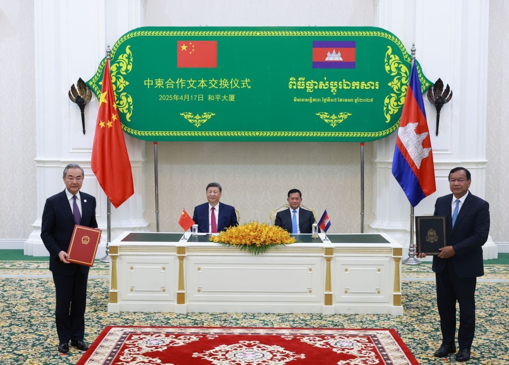 產(chǎn)供鏈合作、人工智能合作、發(fā)展援助合作、海關(guān)檢驗檢疫合作……雙方代表一次次走上大廳中央的紅色方毯,交換合作文本。深化更高水平政治互信、拓展更高質(zhì)量互利合作、筑牢更高層次安全保障、開展更高頻率人文交流、強化更高標(biāo)準(zhǔn)戰(zhàn)略協(xié)作,從五大領(lǐng)域發(fā)力,中柬關(guān)系向更高水平邁進。