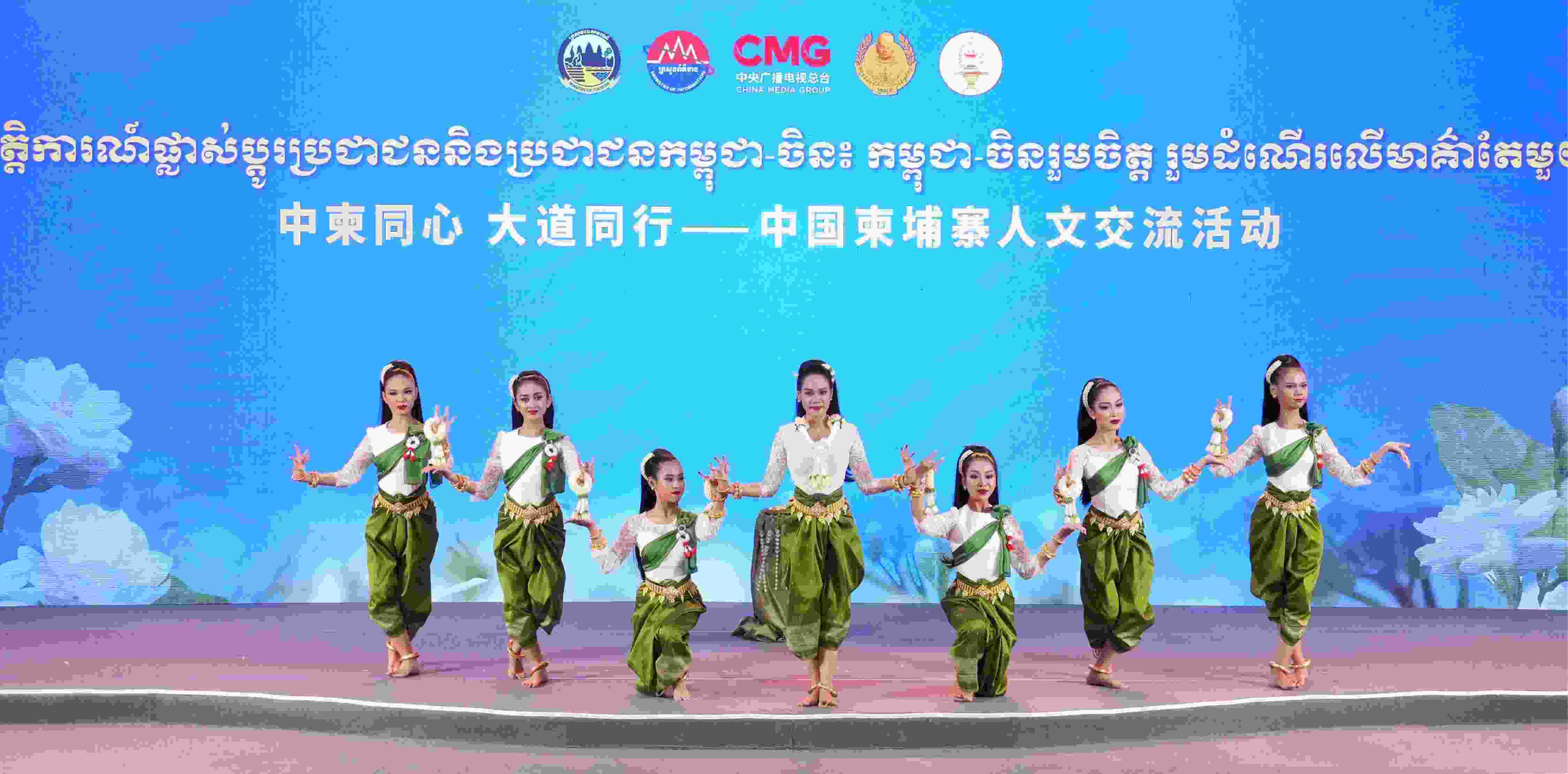 △2025年4月17日,“中柬同心 大道同行——中國柬埔寨人文交流活動”現(xiàn)場,來自柬埔寨帕花黛維公主舞蹈學校的師生代表在中國民歌《茉莉花》的旋律中表演柬埔寨傳統(tǒng)舞蹈。