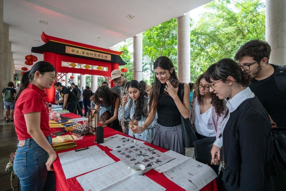 △2025年4月,在巴西里約熱內(nèi)盧天主教大學(xué)舉辦的“國際中文日”慶?;顒由希瑢W(xué)生們體驗中文書法。