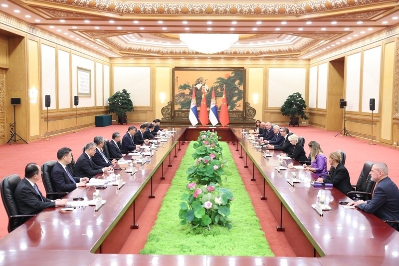 9月4日下午,國家主席習近平在北京人民大會堂會見來華出席紀念中國人民抗日戰(zhàn)爭暨世界反法西斯戰(zhàn)爭勝利80周年活動的塞爾維亞總統(tǒng)武契奇。新華社記者 丁林 攝