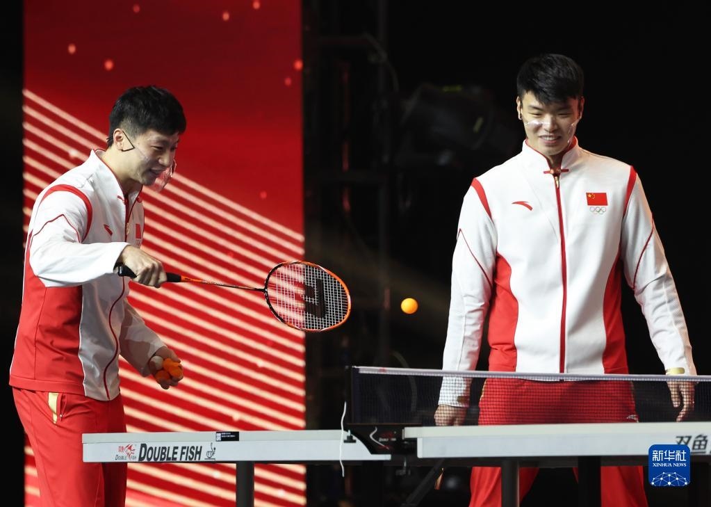 12月20日,內(nèi)地奧運健兒代表團成員馬龍(左)與王懿律在活動中參與游戲。