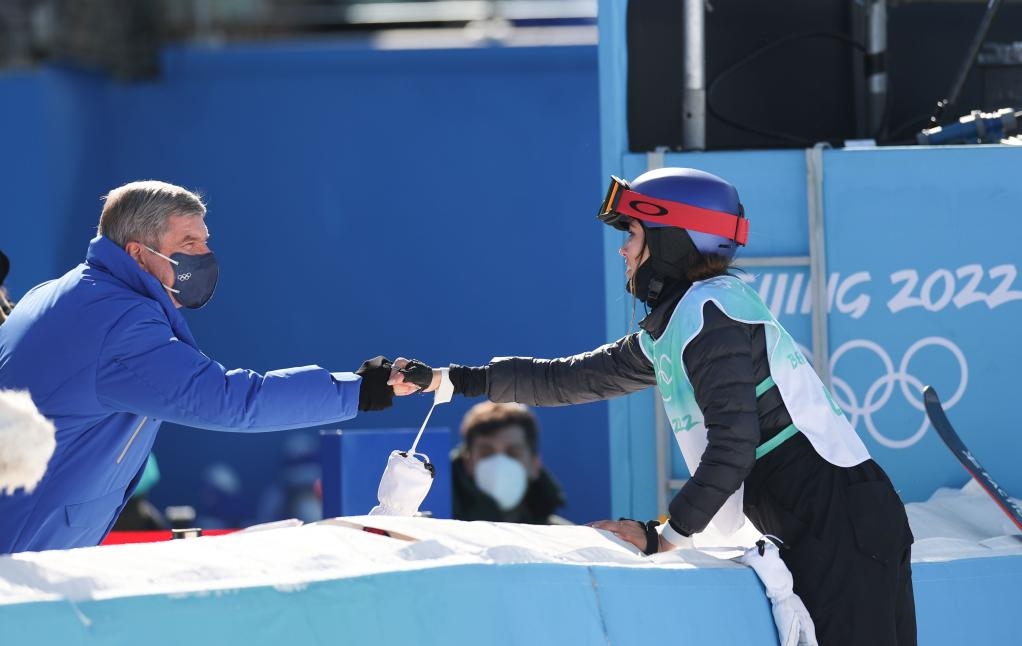 2月8日,國際奧委會主席巴赫(左)向中國選手谷愛凌表示祝賀。新華社記者丁旭攝