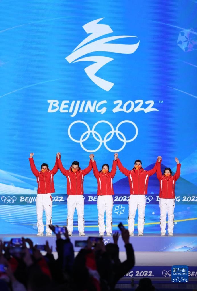 2月6日,北京2022年冬奧會(huì)短道速滑混合團(tuán)體接力獎(jiǎng)牌頒發(fā)儀式在北京賽區(qū)頒獎(jiǎng)廣場(chǎng)舉行。