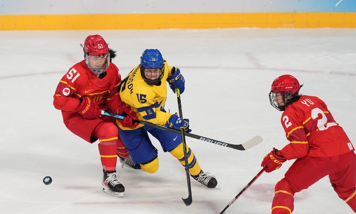 2月7日,中國隊(duì)球員張喜芳(左)與瑞典隊(duì)球員莉薩·約翰松(中)在比賽中拼搶。新華社記者孟永民攝