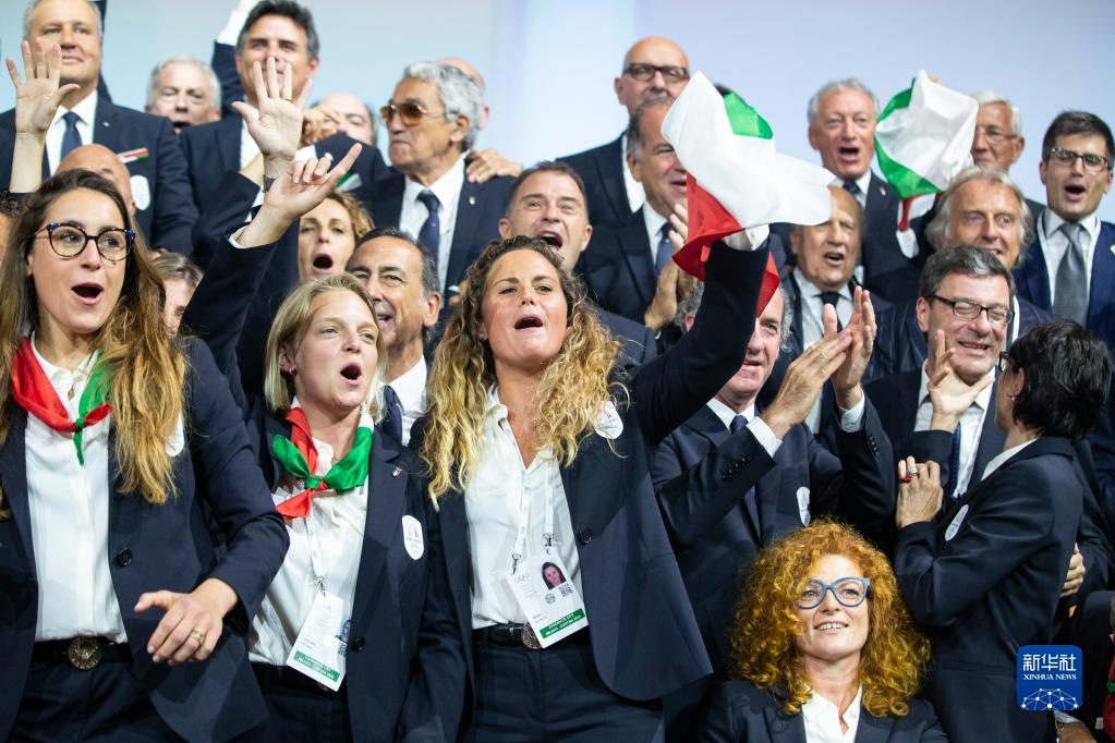 2019年6月24日,意大利米蘭/科爾蒂納丹佩佐申冬奧代表團成員慶祝獲得2026年冬奧會舉辦權(quán)。新華社記者徐金泉攝