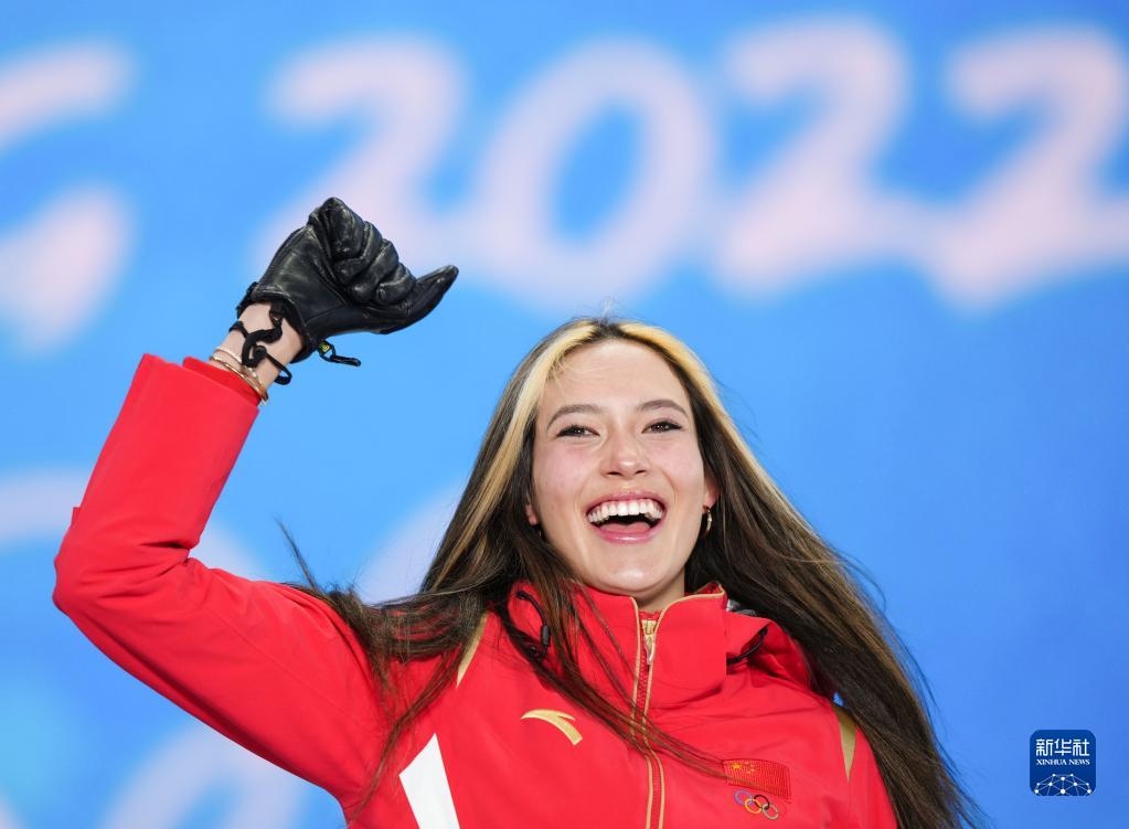 2月18日,冠軍中國(guó)隊(duì)選手谷愛(ài)凌在自由式滑雪女子U型場(chǎng)地技巧獎(jiǎng)牌頒發(fā)儀式上。新華社記者薛玉斌攝