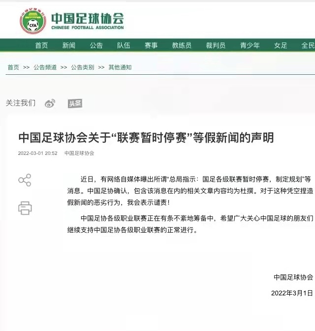 “近日,有網(wǎng)絡(luò)自媒體曝出所謂‘(體育)總局指示:國足各級聯(lián)賽暫時停賽,制定規(guī)劃’等消息。中國足協(xié)確認,包含該消息在內(nèi)的相關(guān)文章內(nèi)容均為杜撰。對于這種憑空捏造假新聞的惡劣行為,我會表示譴責!”中國足協(xié)在聲明中說。