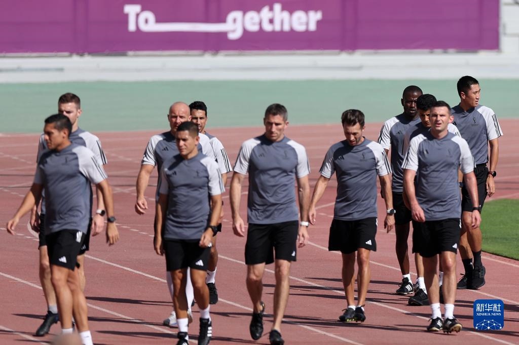 11月18日,國際足聯(lián)裁判委員會主席皮耶路易吉·科利納(后右)觀看訓(xùn)練。新華社記者 賈浩成 攝