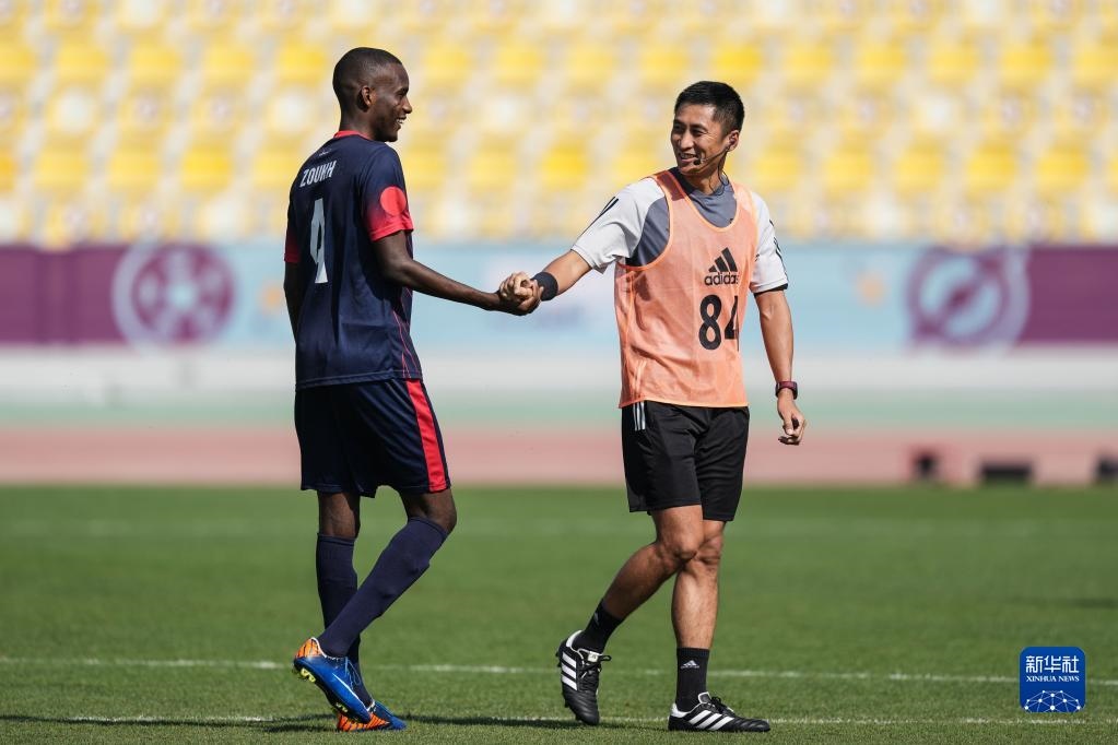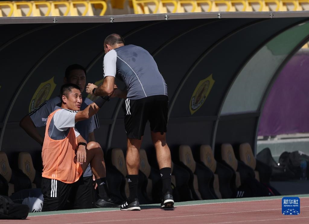 11月18日,中國裁判馬寧(右)在訓(xùn)練中與球員致意。新華社記者 潘昱龍 攝