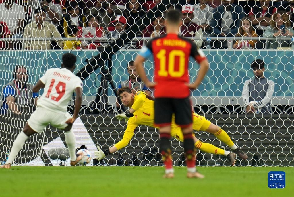 11月23日,比利時(shí)隊(duì)守門員庫(kù)爾圖瓦(后)在比賽中撲出加拿大隊(duì)球員阿方索·戴維斯(左)的點(diǎn)球。新華社記者 孟鼎博 攝
