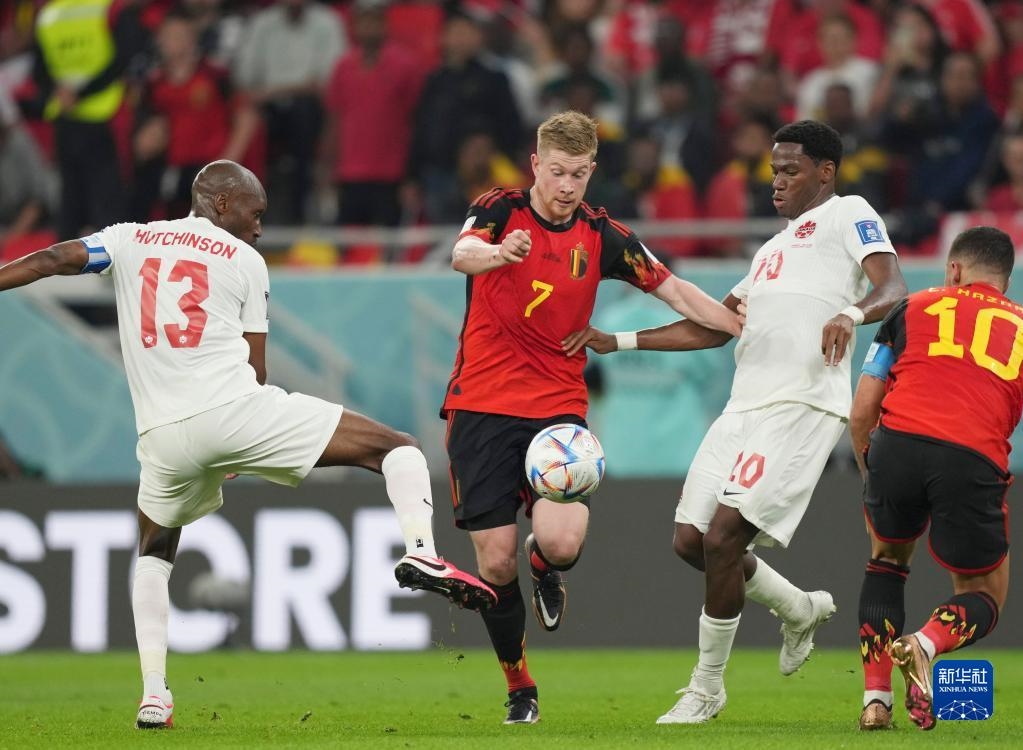 11月23日,比利時(shí)隊(duì)球員德布勞內(nèi)(左二)在比賽中進(jìn)攻。新華社記者 李鋼 攝