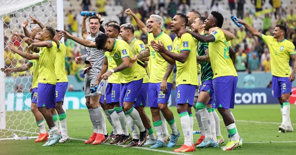 11月24日,巴西隊(duì)在賽后慶祝勝利。新華社記者徐子鑒攝