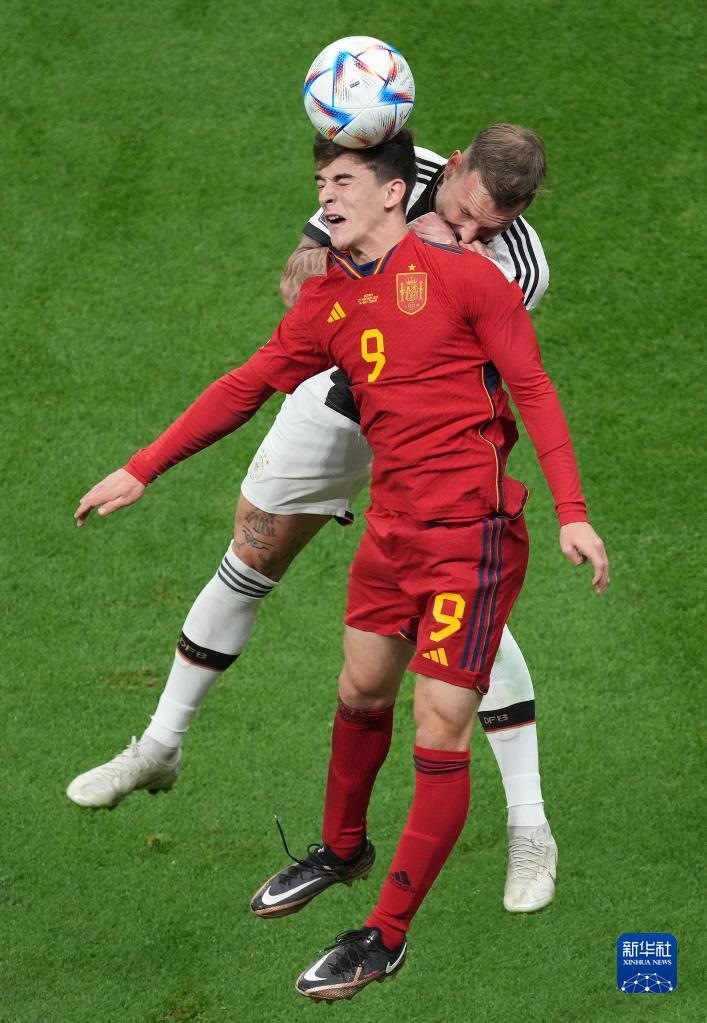 11月27日,西班牙隊(duì)球員加維(前)與德國(guó)隊(duì)球員戴維·勞姆在比賽中爭(zhēng)頂。新華社記者 陳誠(chéng) 攝