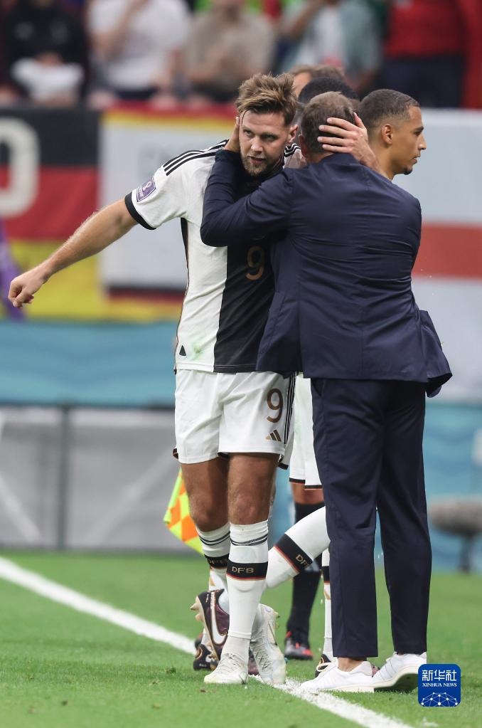 11月27日,德國(guó)隊(duì)球員尼克拉斯·菲爾克魯格(左)在比賽中進(jìn)球后與主教練漢斯·弗利克慶祝。新華社記者 曹燦 攝