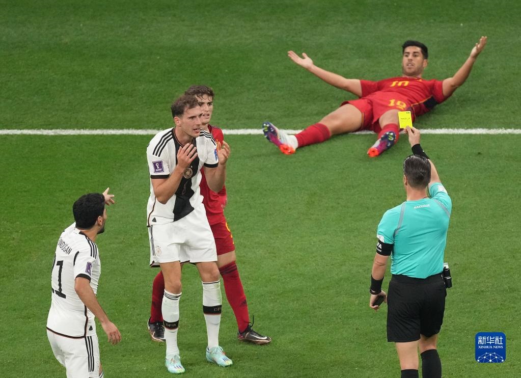 11月27日,主裁判在比賽中向德國(guó)隊(duì)球員萊昂·格雷茨卡(左二)出示黃牌。新華社記者 陳誠(chéng) 攝