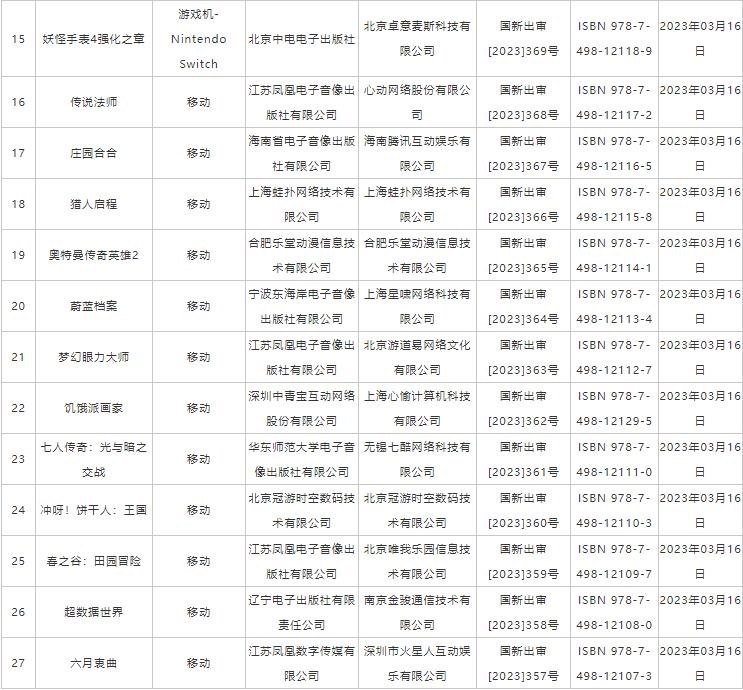 人民網北京3月21日電 (記者楊虞波羅)據(jù)國家新聞出版署官網消息,3月20日,2023年進口網絡游戲審批信息正式發(fā)布,共27款游戲獲得游戲版號,其中包含22款移動游戲、3款PC游戲、1款雙端游戲、1款NS游戲機游戲。