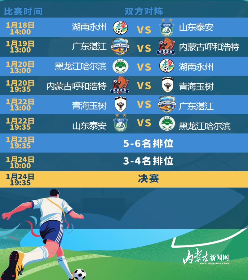 群眾足球風(fēng)云再起,一場(chǎng)匯聚南北、融合競(jìng)技與文化的群眾足球盛宴即將激情上演。1月18日至1月24日,CMG群眾足球邀請(qǐng)賽將在湖南省永州市拉開帷幕。1月11日晚,抽簽結(jié)果正式揭曉,呼和浩特隊(duì)將于1月19日首戰(zhàn)粵超冠軍廣東湛江隊(duì)。球隊(duì)將于1月16日啟程,在永州進(jìn)行合練。
