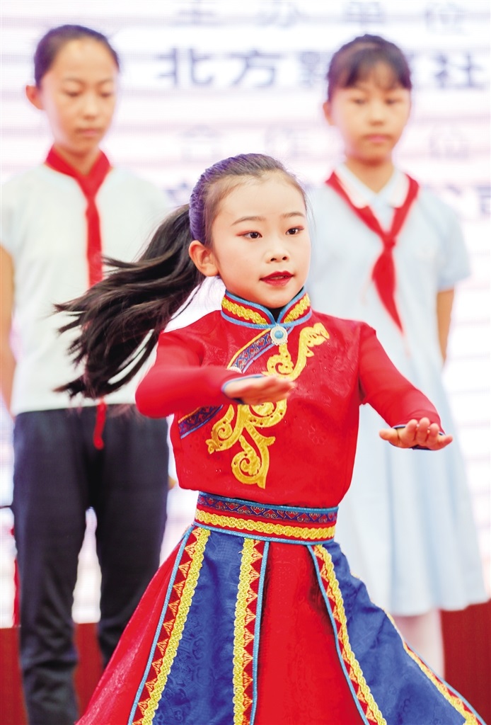 同樣來自騰飛路小學(xué)三年級(jí)5班的寧悅彤壓軸出場(chǎng),在舞臺(tái)上激情四射的啦啦操表演獲得了很高的分?jǐn)?shù)。就在前一天,她和她的小伙伴們代表學(xué)校參加呼和浩特市第六屆中小學(xué)啦啦操健美操大賽,捧回了團(tuán)體第一的驕人成績(jī)。寧悅彤在后臺(tái)接受記者采訪時(shí)說:“第一次站上這樣大的舞臺(tái)表演,起初有點(diǎn)緊張,有幾個(gè)動(dòng)作在表演過程中需要身體接觸地面,會(huì)很疼,但這是必須要承受的。我覺得這次經(jīng)歷也讓我更加勇敢,更加自信了?!?/p>