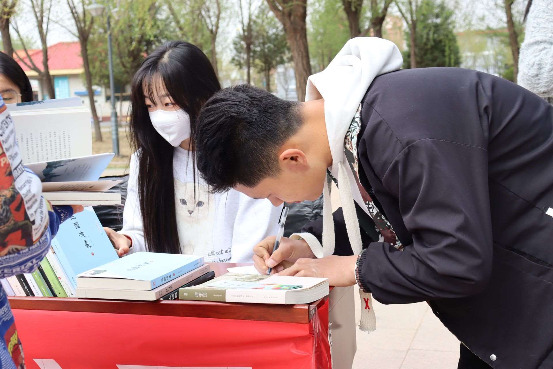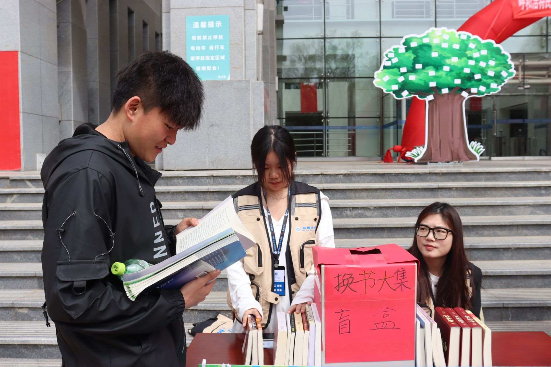 風(fēng)和日麗,春暖花開。4月23日,第28個世界讀書日,呼和浩特民族學(xué)院在南區(qū)圖書館前開展“換書大集”活動,現(xiàn)場共設(shè)置18個換書展位,特別設(shè)立換書“盲盒區(qū)”,現(xiàn)場換書300余本,同學(xué)們廣泛參與,場面火熱。