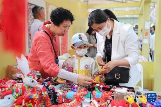 6月10日,在哈爾濱市索菲亞廣場非遺工坊展,市民在了解傳統(tǒng)手工布藝展品。
