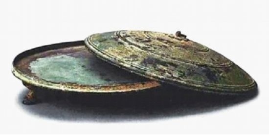 隨著青銅器、鐵器的出現(xiàn),陶鏊逐漸被替代。1989年3月,河南省焦作市嘉禾屯林場(chǎng)磚瓦窯發(fā)現(xiàn)一座漢代銅器窖藏,出土了一件極為罕見(jiàn)的帶蓋弦紋青銅鏊。