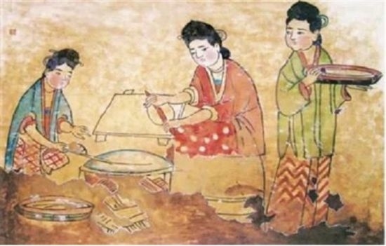 2003年,河南省登封市高村發(fā)掘了一座宋代壁畫(huà)墓,其中的“烙餅圖”非常生動(dòng)寫(xiě)實(shí)。畫(huà)中有3位女子,左側(cè)女子正在鏊子前持物翻餅,其右置一圓盒,內(nèi)有烙好的煎餅。鏊子呈穹廬狀鼓起,同現(xiàn)在常見(jiàn)的鐵鏊無(wú)異。中間女子正在矮案前持兩頭尖、中間粗的搟面棍搟制面皮。右側(cè)女子雙手托盤(pán),似走卻又回首觀望。整幅壁畫(huà)色彩艷麗,人物各具情態(tài),栩栩如生。
