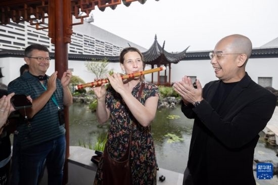 6月25日,柏林愛(ài)樂(lè)樂(lè)團(tuán)的樂(lè)手在嘗試吹奏中國(guó)竹笛。